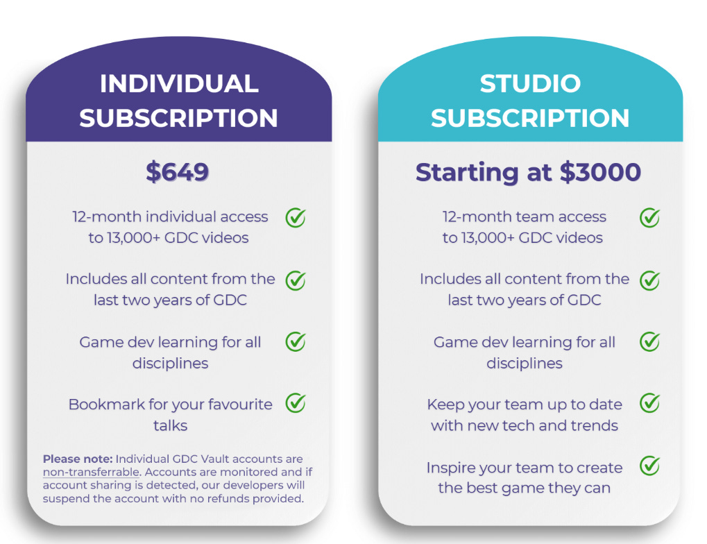 GDC’s owner Informa is a multi-billion pound corporation that runs a variety of events worldwide, and relies heavily on gatekeeping information by relying on the sentiment that their events are the place for professionals to converge. Introducing a real FOMO aspect to their portfolio. It doesn’t really need the cash from selling vault subscriptions, but it still does it and at exorbitant cost: $649 for individuals, and $3000 or higher for studios per year.