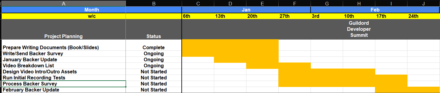 But we’re at the point now that we have a spreadsheet! The all important planning document, and as you can see I’m also trying to ensure that we identify where other obligations are in the calendar so we can plan in advance! I mean the Guildford Developer Summit is just one day, but for example GDC I will lose close to two weeks of work time to that.