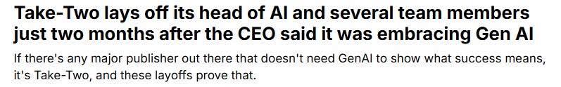 It doesn’t help that most of this stems from that many outlets simply reported off the back of the Kotaku article (see Eurogamer, GI.biz and Engadget) or PCGamers’ (I mean the RPS and TheGamer articles are just copies of it), but also that it is then presented with zero context. Given this is not a particularly big event on its own, every publication then pivots to making unrelated points on AI in the games industry, to sound like it’s part of a bigger developing narrative. More often than not falling back onto former comments on AI by Take Two. Such as President Karl Slatoff’s recent musings on Google’s Genie 3 to CEO Strauss Zelnick’s opinions on Generative AI that range from intrigued to ambivalent.
