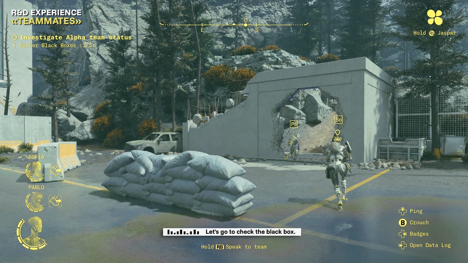 Teammates is a first-person shooter in the Snowdrop engine (used for games like Tom Clancy’s The Division, Star Wars: Outlaws, and Avatar: Frontiers of Pandora) in which the player has to complete a series of objectives with two companion NPCs: Sofia, and Pablo. While in addition to this, you also have Jaspar, a separate AI companion that acts as your ‘guy in the chair’ and provides assistance and support to your experience in a rather self aware fashion. With these three ‘characters’, you are tasked with finding and collecting five black boxes from damaged androids in the map, fighting off NPCs and completing puzzles as you go.